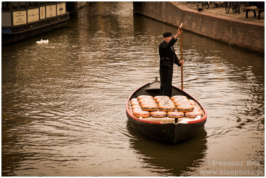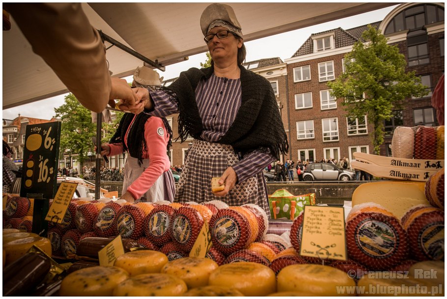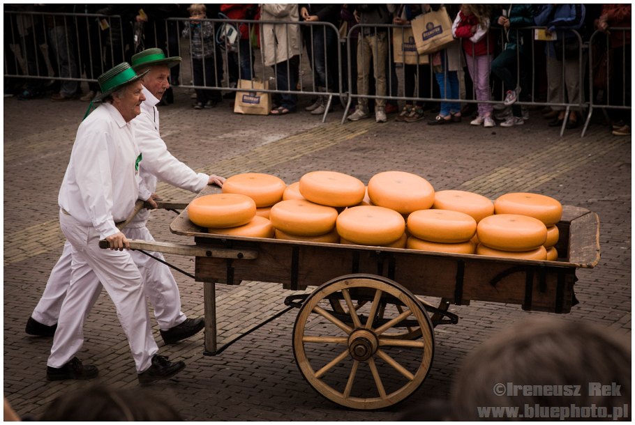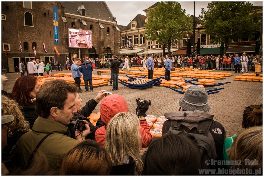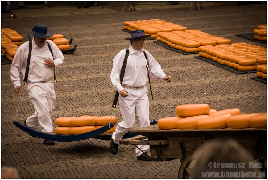 Następny dzień to piątek a w każdy piątek od kwietnia do września w pobliskim ALKMAAR odbywa się targ serowy. Zwyczaj ten sięgający swymi korzeniami 1365 roku, kiedy to na Waagplein w centrum miasta ustawiono pierwszą wagę do ważenia sera przetrwał tylko tutaj. Kiedyś holenderska codzienność, dziś funkcjonuje jako turystyczna atrakcja. Choć... nie tylko. Nadal specjalna komisja ocenia produkty poszczególnych cechów wycinając serowych bułach otwory i oceniając ich jakość. Sery produkowane przez cztery różne cechy są ważone a następnie wracają na plac gdzie są ładowane na specjalne wózki i przewożone do znajdujących się poza placem ciężarówek, które rozwożą towar po kraju. Przedstawiciele cechów ubrani są w tradycyjne białe stroje, wyróżniaj ich tylko kolory wstążek na kapeluszach. Podzieleni na siedmioosobowe grupy nosiciele układają swoje produkty na specjalnych nosidłach (w tych samych kolorach, co wstążki) i biegiem przemieszczają się między waga a placem. A maja co nosić. Na noszach naraz mieści się do 130 kilo!
