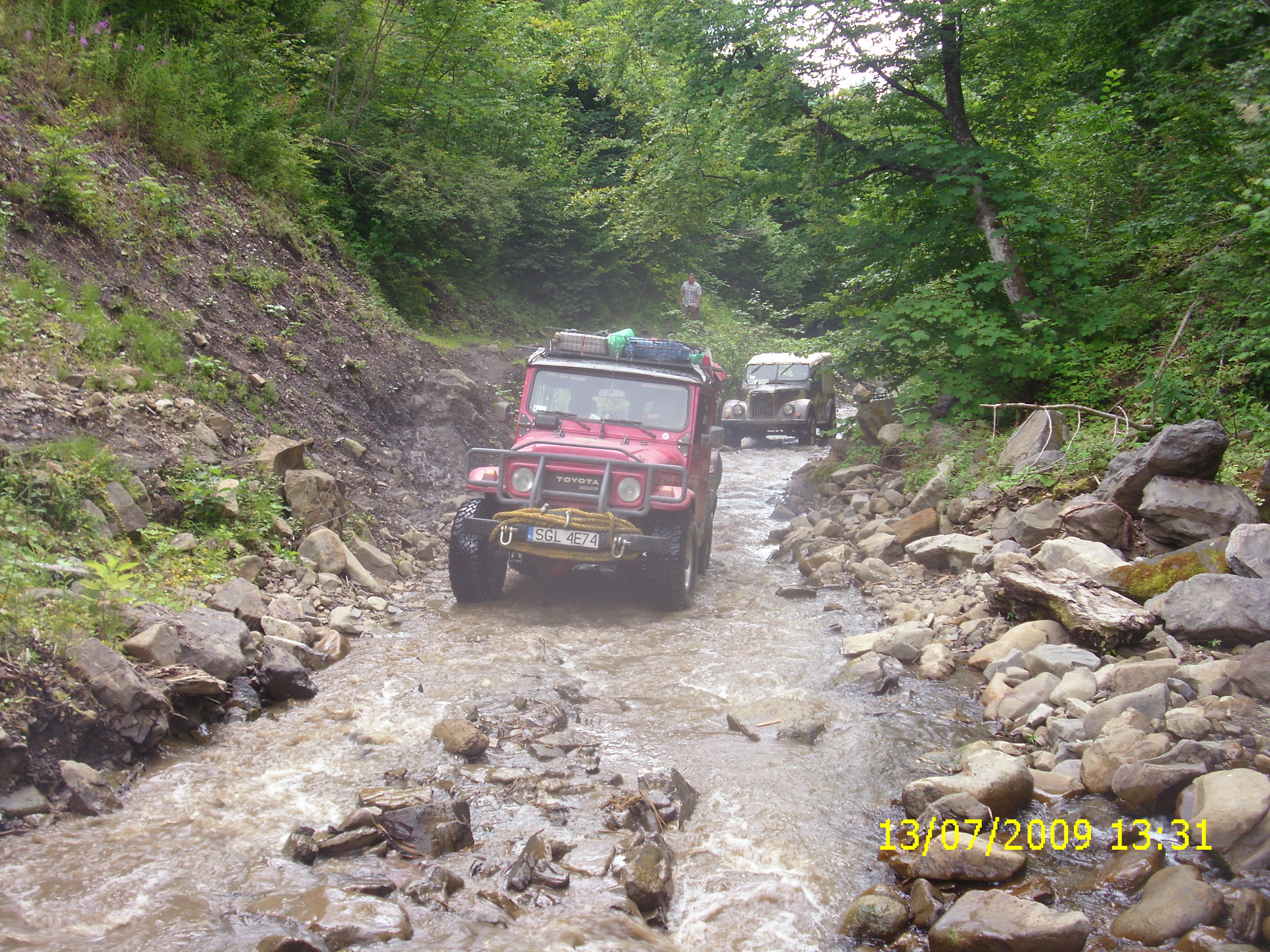 Kierujemy się w stronę Krzemieńca, Wiśniowca miejsca urodzin księcia Jeremiego Wiśniowieckiego. W pewnym momencie skuszony pogaduszkami przez radio skręcam w boczną drogę w pola no nic kierunek wskazany przez kompas zachowany wiec można i tak. Pierwszy raz włączamy przedni napęd i reduktor. Droga gliniasta ostro pnąca się pod górę, z rowem pośrodku zrobionym przez rwącą wodę powoduje ze auto nie ma dobrej przyczepności i co rusz zawisa na dwóch kołach tracąc kontakt z podłożem. Jak się później dowiedziałem były to niezłe trawersy i sprawdzenie jak zachowują się nasze auta na wykrzyżach, a to że o mały włos nie położyłbym mojej Toyoty na boku, budziło nie skrywany dowcip u moich kompanów podróży i docinki o jakimś chrzcie zaliczeniu "boka" czy coś w tym rodzaju. W końcu przebywałem w gronie doświadczonych offroudowców a ja może nie laik terenu ale z pewnością nie pasjonat tego typu terenowych przygód. Och, gdybym ja wtedy wiedział że to nawet nie preludium późniejszych przygód… Po zdobyciu wzniesienia wjeżdżamy do lasu ale nie drogą, tylko szlakiem zrywkowym, który z każdym metrem się zawęża, by w końcu zniknąć w wysokich trawach. No tak stoimy w lesie bukowym, w pięknym starodrzewiu ale co robić dalej, gdzie jechać? Ojciec wisi na jakimś pniaku, wywały drzew tarasują przejazd, drogi powrotnej nie ma. Tylko Bobik nie traci animuszu i zapału, wtóruje mu Prezes. I znaleźli przesmyk, przy dobrej woli naszych aut można przejechać.