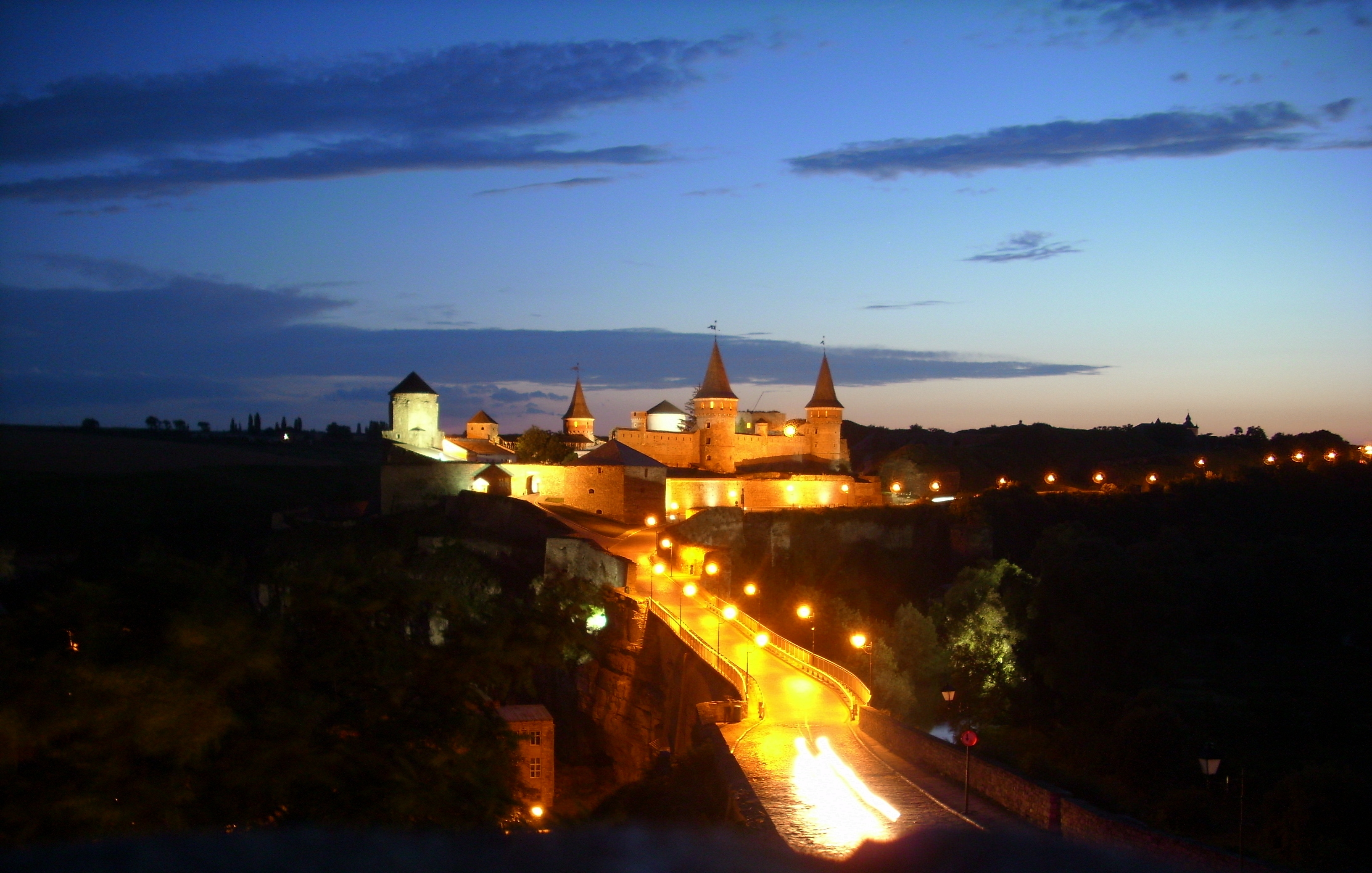 Nie wiem jak to się stało ale do miasta wjeżdżamy od strony południowej. Po lewej widać starówkę, z daleka przykuwa oczy muzułmański minaret przyklejony do polskiej katolickiej katedry, stare miasto pełne zabytkowych budowli zamknięte głębokim jarem rzeki Smotrycz otoczone wysoką na kilkadziesiąt metrów bruzdą pionowych skał gdzie u zbiegu stromizn, w najwyższym niedostępnym punkcie urwiska stoi historyczna twierdza, ostatni bastion chrześcijaństwa. Zachwycający widok twórczości sił natury i piękna tego miejsca tworzonego ręką człowieka, kiedyś służąca obronie europy teraz zachwyca swoją burzliwą historią i pięknem. Siostry witają nas z większym zaciekawieniem niż serdecznością, każą czekać na przełożoną. Po dziesięciu minutach przychodzi siostra z uśmiechem na twarzy, wita nas serdecznie, poznaje mnie, wszak jestem tu można powiedzieć stałym gościem, to już moja czwarta wizyta w Klasztorze. Od razu zaznacza że jesteśmy dzień spóźnieni i na dzisiejszą noc ma dla nas pokoje, natomiast co do dalszego pobytu mogą być kłopoty. Stary dom pielgrzyma zajęty jest przez harcerzy i grupę młodych fotografów z Warszawy, do nowego jutro przybywa wycieczka z Pomorza gdańskiego. Wyczuwam w jej głosie propozycję o której zdaje się nie chce mówić. W tym czasie znikną mi z oczu Ojciec, to znaczy Tomek. Gdzieś przepadł wraz z księdzem Rafałem. Sprawa zaraz się wyjaśniła. Powodowani wspaniałym zapachem wydobywającym się z kuchni klasztornej po prostu włamali się do jadalni i tak zbałamucili siostry kucharki, że te nie widząc innego wyjścia zaprosiły nas, całą naszą dziewiątkę na pyszną kolację. Był to prawdziwy bigos, chleb, herbata. Po całym dniu suchego prowiantu i jedzenia na chybcika gdzieś skurzeni byle czego w wątpliwych Ukraińskich knajpach ta potrawa jawiła się jak królewskie danie i smakowała wybornie. Najedliśmy się do syta w przyklasztornej kuchni. Gorąca kąpiel, czyste schludne pokoje, wygodne łóżka i miła atmosfera dopełniły resztę i podniosły nasze morale na szczyty. W doskonałych humorach (pomni by wrócić przed 23 bo zamykają bramę klasztoru) ruszamy w miasto a tak naprawdę na piwo i drinka, by już całkowicie przepłukać z kurzu ukraińskich pól i stepów nasze gardła. Jak szybko zmienia się miasto dostosowując do coraz większej ilości turystów, to starówka kamieniecka może być tego świetnym przykładem a nawet swego rodzaju wzorcem, sześć lat temu gdy byłem tu pierwszy raz spożycie piwa czy nawet coli w całym Kamieńcu po godzinie 22 było nie możliwe. Żadna restauracja, nie mówiąc już o barze czy pubie nie była otwarta. Zresztą w całym mieście było ich niewiele, lampy uliczne się nie paliły, miasto spowite było mrokiem, żadnych spacerowiczów, przechodniów zupełna cisza i pustka, tylko co jakiś czas ulicą przemknęła łada milicyjna. A teraz co krok to zajazd, gospoda, piwiarnia,… Kościoły, ratusz, twierdza wszystko podświetlone, ulice w pełnym blasku przydrożnych latarń, grupy roześmianej młodzieży spacerują rozmawiają bawią się, na Polskim Rynku panuje gwar, nie widać milicji, miasto tętni życiem i radością.