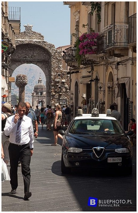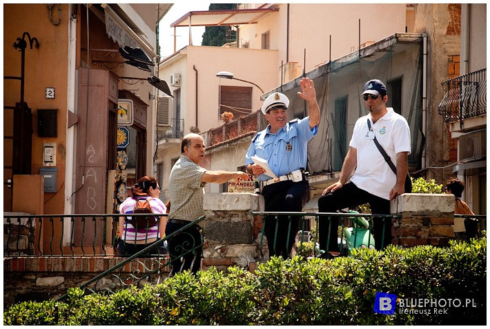 I widok ogromnej ilości domow i hoteli poutykanych na pobliskich wzgórzach. Prowadzi nawigacja więc śmialo jedziemy do centrum rozgladając się za parkingiem. Do zabytkowego centrum oczywiscie nie mozna wjechać, czego pilnuje policjant. I dobrze, juz z daleka widać tabuny ludzi przeciskajace sie główna ulicą Corso Umberto I a miejscowi wjadą wszędzie i zaparkują wszędzie gdzie sie da. Zatrzymać się nie ma gdzie. Trzeba zawarać ale jak to zrobić w waskiej uliczce pikapem o długosci ponad 5 m? Sie jakoś udało (za nami korek na kilometr