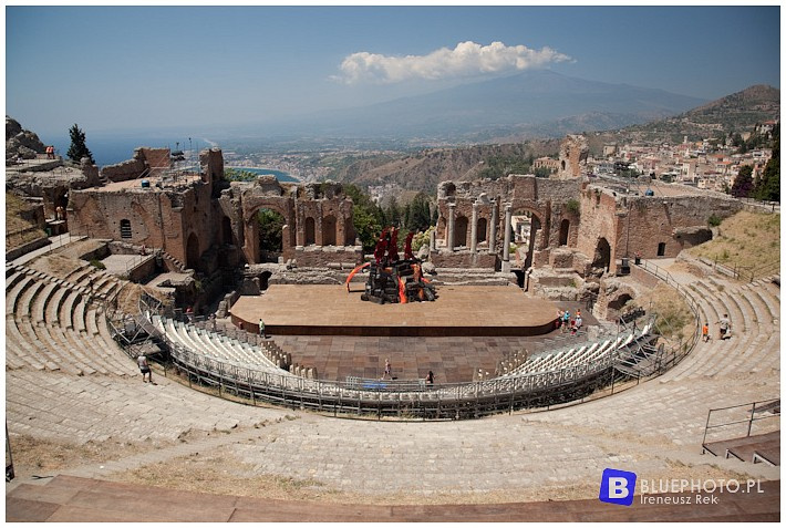 Dla nas najbardziej interesujacy był Teatr Grecki. Wspinamy się waska uliczką by w kasie biletowej zapłacić za wstęp i udać sie na trybuny by podziwiać widownie (cavea) na 5000 miejsc, scene (pulpitum) oraz pozostałosci budynku scenicznego zwanego skene. Jak widać na załaczonych zdjeciach zachował się w całkiem przyzwoitym stanie. Jest też nadal wykorzystywany o czym świadczą dekoracje oraz niestety rzędy metalowych miejscówek umieszczonych na orginalnych siedziskach. Kazdy będąc tutaj podziwia przede wszystkim wspanialy widok na Etnę, pobliskie morze, miasto. Będąc w Taorminie koniecznie musicie odwiedzic to miejsce.