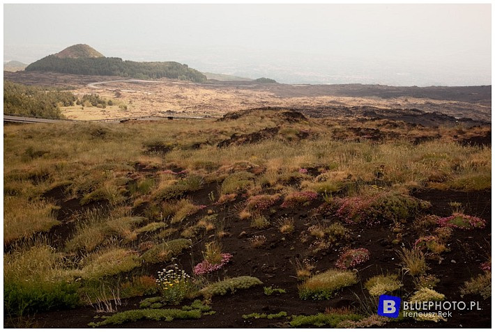 Wokół Etny utworzono Park Narodowy, który na mapie rozlewa się ogromnym zielonym kleksem z bardzo mała iloscia dróg. Z Rosolini nie jest tu daleko, tylko okolo 150 km ale… gdy już trzeba zjechać z autostrady zaczyna sie jazda po serpentynach. Poczatkowo widoków i emocji brak – jedziemy w gestym, zielonym lesie. Po całych dniach spedzonych w wypalonych słońcem klimatach jest to miła odmiana. Naraz zieleń znika i zaczynaja się łaki a potem całe pola czarnej, zastygłej lawy na przemian z kolorowymi pyłami. Zatrzymujemy się w dogodnym miejscu i łazimy po czarnym piachu i skałach zerkając ciekawie na resztki spalonych domów widocznych z drogi, na rosliny pracowicie kolonizujące kolorowymi plamami morze pyłów i skał.