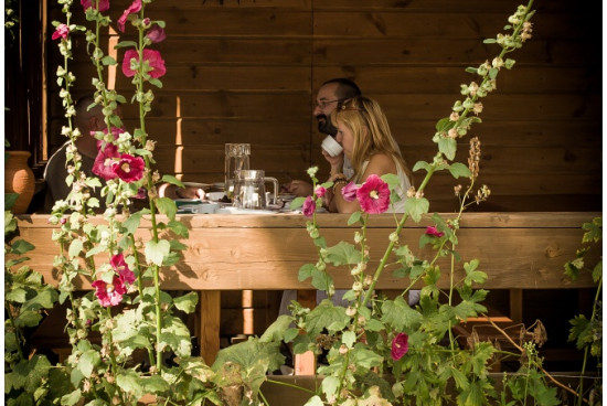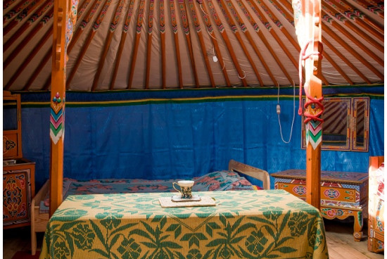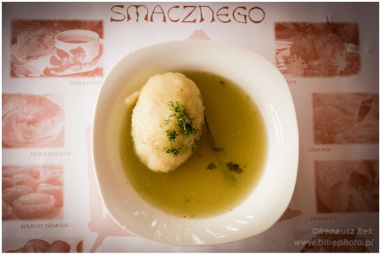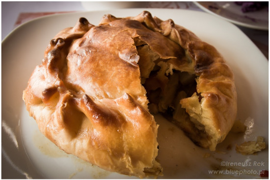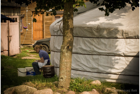 Na miejscu zatrzymujemy się przed drewnianym domkiem jakich wiele tutaj. (Uwaga - wcześniej mijamy restauracje stylizowaną na gospodę ale to nie to miejsce). Jest duży parking, chata z zacienionym i ładnie obrośniętym zielenią tarasem oraz co już bardziej egzotyczne prawdziwa tatarska jurta z wyposażeniem (można wejścia i wszystkiego podotykać, właściciele liczą na uczciwość swoich gości i do tej pory się nie zawiedli ;) oraz zagroda dla koni. Posiłki latem spożywa się na tarasie. Jest sporo ludzi ale i dla nas znalazła się duża ława przy której zmieściło się w sumie dziewięć osób (w tym troje maluchów) Ponieważ chcemy spróbować wszystkiego - zamawiamy wszystko ;). Tzn. wszystkiego po jednej porcji, żeby spróbować. No może oprócz kołdunów w rosole - te każdy ma swoje ;). Potem bielusz i pierekaczewnik. Ten pierwszy jest na cieście drożdżowym natomiast drugi - makaronowym, oba z farszem gęsim lub baranim z dodatkiem cebuli i przypraw spiralnie zawijane. Dalej pieremiacze, dzajma, czak czak i chałwa mączna, Do posiłków dostajemy syte - czystą wodę syconą miodem, doprawioną do smaku sokiem z cytryny. Desery popija się kawą "turecką" gęstą i słodką oraz herbatą, Dziś po kilku latach od wizyty w Kruszynianach (2007r) nie potrafię już dokładnie opisać co jak smakowało. Pozostało tylko ogólnym wrażeniem - wszystko było pyszne.