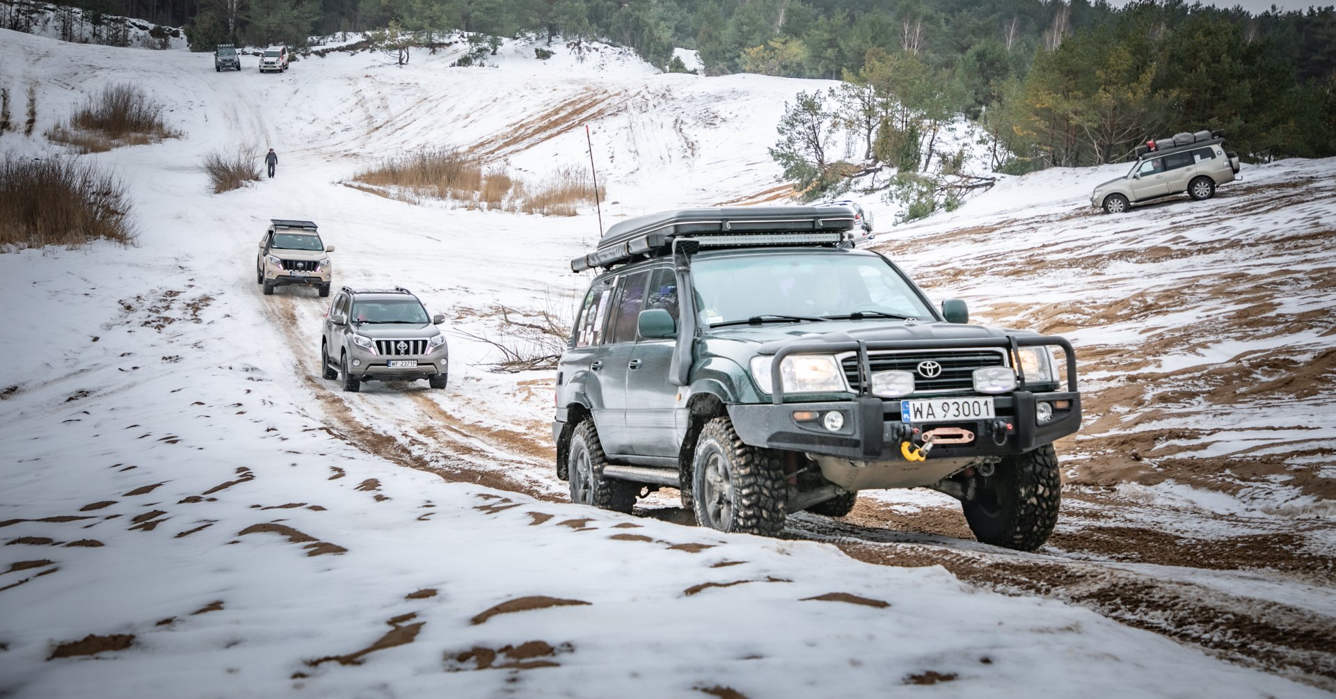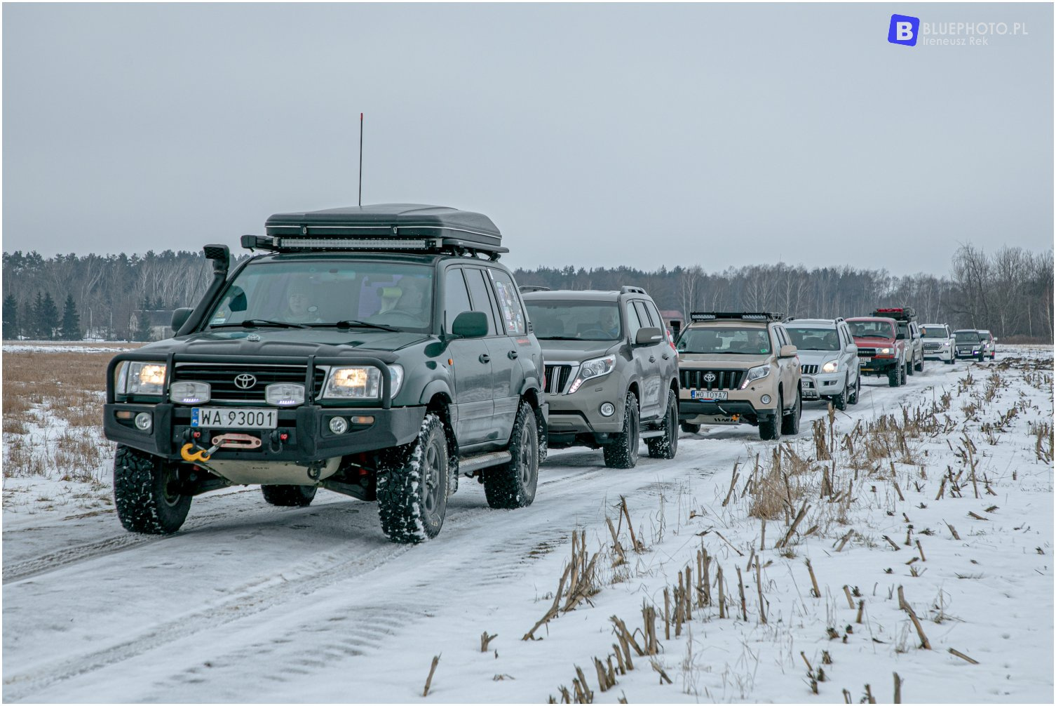 Start wycieczki był jak zwykle o godzinie 10.00. Tym razem nadspodziewanie wiele aut, w tym goście, którzy dołączyli do nas w autach Mitsubishi Pajero. Poza nimi głównie Land Cruisery 150 oraz 120. Dodatkowo 80-ka, 100-ka i oczywiście Hilux, którym układaliśmy trasę. Początek dnia to przejazd przez malownicze, zasypane śniegiem pola i lasy. Potem pierwszy postój i próby terenowe na piaskarni. Dąbrówka to bardzo ciekawe miejsce, gdzie można sprawdzić swoje umiejętności na piaskowych podjazdach i zjazdach. Tym razem zmarznięte podłoże nie stanowiło problemu. Ciekawie za to będzie wiosną, przejazdy przez szuwary zrobią się grząskie i nieprzewidywalne, a piasek sypki i wymagający dla opon oraz silnika.