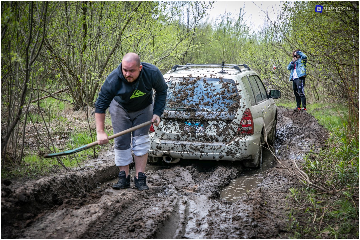 Zawsze jednak znajdzie się alternatywa i pomysł jak poradzić sobie z przeszkodą, szczególnie gdy bywało się w tych okolicach i posługiwanie się mapa to nie problem. Jednak nawet miejsca, które wcześniej były tylko lekko trudne terenowo, tym razem okazały się wyzwaniem. Przekonali się o tym nasi przyjaciele za kierownicą Japończyka ze stajni Subaru. Auto bardzo dzielne wcześniej, w grubym błocie jednak powiesiło się i… tu okazało się dlaczego w Suv-ie wybierającym się w teren tak ważne są zaczepy do holowania. Ich brak spowodował, że incydent, który powinien być załatwiony w 5 minut potrwał grubo ponad pół godziny.