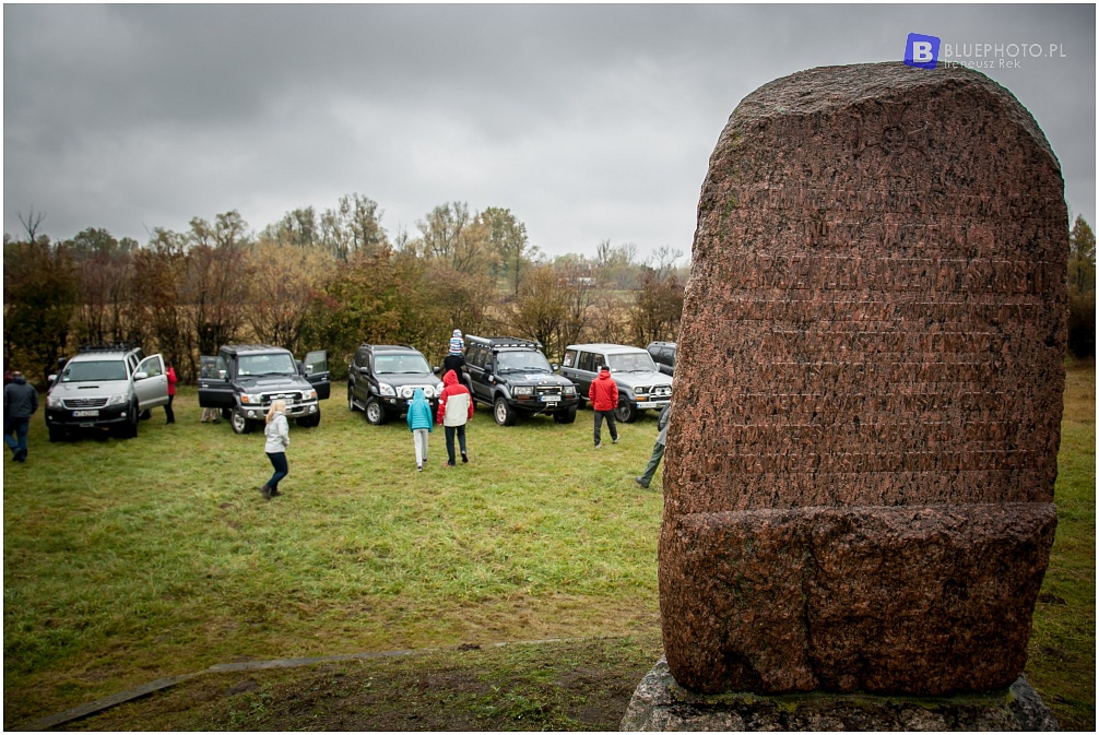 Pierwszy cel to odnalezienie obelisku upamiętniającego dekorację Krzyżem Virtuti Militari przez marszałka Józefa Piłsudskiego artylerzystów konnych za wojnę 1920 roku. Błonia Kawaleryjskie z ziemnym kopcem i pamiątkowym kamieniem zrekonstruowano w 1989 roku. Przygotowujący trasę Michał Bartosiak doprowadza nas na ukrytą z dala od dróg łączkę. Chwila spaceru, pamiątkowe zdjęcie i uciekamy z deszczu do ciepłych aut. Jest mokro, pełno błota, terenowo. Czyli wszystko to, co podoba się podczas takich wypadów.