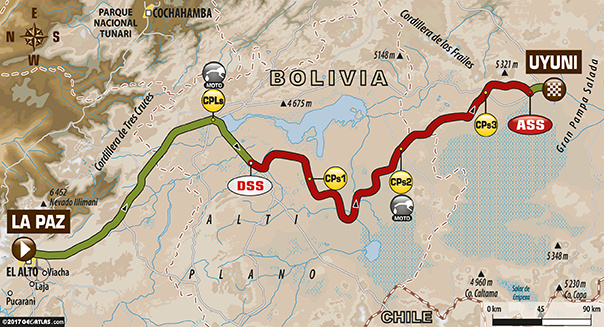 Rajd Dakar opuścił dziś Altiplano - płaskowyż w Andach Środkowych, zjeżdżając do Argentyny. Na pożegnanie Boliwii ponownie zmieniono odcinek specjalny, który planowo powinien mierzyć 492 km. Opady deszczu w ostatnich dniach podniosły poziom wody w rzece, przepływającej w poprzek trasy.