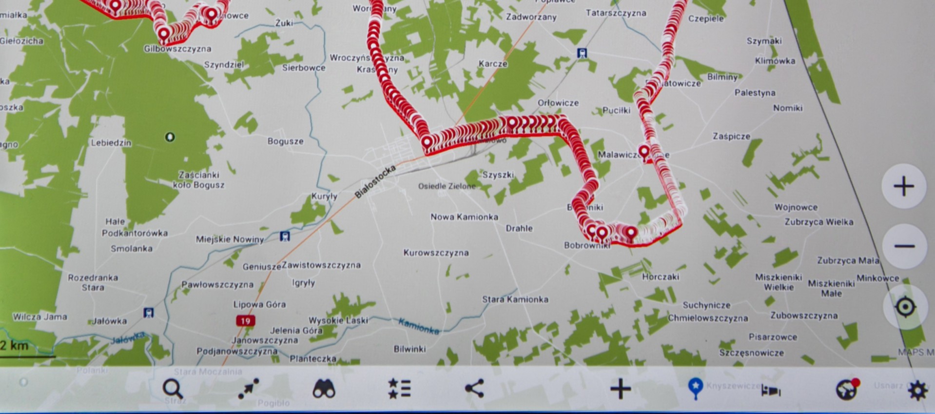 Trzecią kwestią jest fakt, że nawigacja pozwala na przesłanie i wgranie do aplikacji własnego śladu. Jeśli przygotujemy sobie sami lub otrzymamy zapisaną ścieżkę w postaci pliku z rozszerzeniem klm wystarczy wysłać go mailem na skrzynkę znajdującą się na urządzeniu i otworzyć. Android od razu instaluje szlak i jest widoczny w urządzeniu. System na urządzenia mobilne Apple wymaga otwarcia pliku (pokaże sie wówczas niezrozumiały tekst) i kliknięcia w prawym, górnym rogu ikonki wyślij. Na wyświetlonej liście trzeba wybrać program i już, trasa jest widoczna na mapie! O ile na Androida mamy spory wybór innych produktów mapowych, o tyle na sprzęt konkurencji to chyba jedyna darmowa opcja.