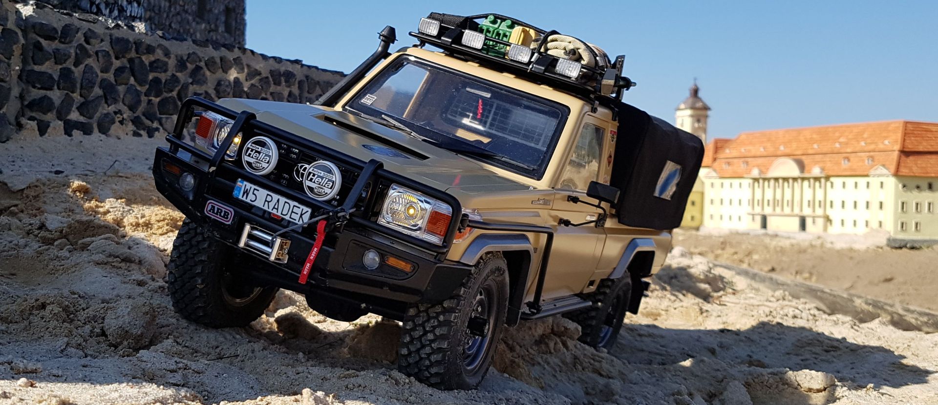 Tutaj należałoby zakupić podwozie, np. AXIAL SCXII i wymienić mu karoserię np. na Toyotę Land Cruiser 80. Podwozie jest bardzo trwałe i bardzo wiele znosi, w tym jazdę w błocie, topienie w wodzie, spore przeciążenia w terenie. Zaproponowana karoseria odzwierciedla auto jeszcze z przed liftingu, gdy na atrapie grilla znajdował sie jeszcze napis TOYOTA.