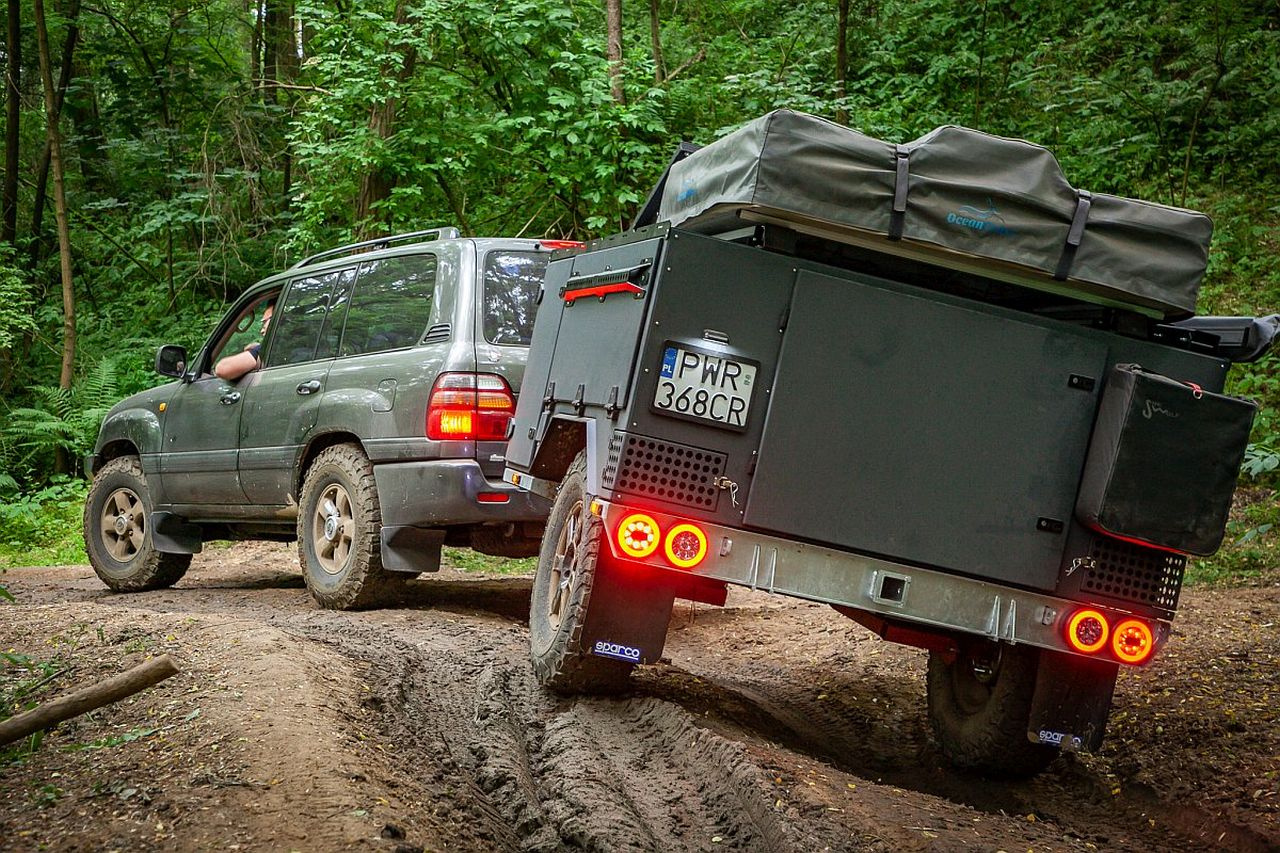 Taka przyczepa nie jest już zwykłą metalową skrzynią ładunkową, a zaawansowanym systemem transportowym wyposażonym w szuflady, rolety, namiot, zbiorniki na wodę, kuchenkę i inne wyposażenie przydatne na dalekiej wyprawie. Jej główną cechą jest jednak to, że została zaprojektowana tak, by spokojnie wytrzymać wszystkie przeciążenia, z jakimi spotkacie się podczas off-roadowych przepraw. Kolejną zaletą jest to, że zwykle terenowe przyczepy wyposaża się w takie same koła jak w aucie, dzięki czemu można wykorzystać koło zapasowe przyczepy do samochodu lub odwrotnie. Zwykle przyczepy tego typu są lekkie, wykonane z nowoczesnych kompozytów, więc nie wymagają specjalnych uprawnień i dodatkowych kategorii w prawie jazdy.