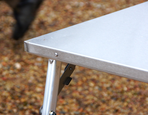 Wykonanie stołu FR budzi mieszane uczucia. Z jednej strony od razu rzuca się w oczy błyszczący w słońcu blat wykonany z blachy nierdzewnej oraz aluminiowe składane nogi, co daje pewność długiej eksploatacji i stabilności stołu. Z drugiej strony rażą kiepsko wykonane szczegóły, np. brzydkie spawy - nieobrobione i chropowate. To samo dotyczy mocowania blatu do ramy – nitami zrywalnymi, których łebki bardzo szpecą.