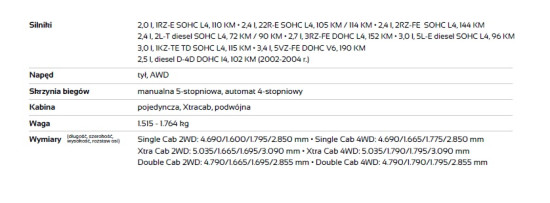 W Europie najczęściej kupowano auta z silnikiem diesla 2L-T o pojemności 2,4 l i mocy od 72 do 90 KM. Do wyboru było oczywiście więcej silników, choć nie w każdym kraju występowały wszystkie jednocześnie. Najmniejszy, dwulitrowy motor benzynowy 1RZ-E o mocy 110 KM, dostępny był tylko w Australii. Kolejne dwie pozycje na liście zajmowały silniki o pojemności 2,4 l. Pierwszy z nich, motor o symbolu 22R-E, miał od 105 KM do 114 KM a drugi, znacznie nowocześniejszy 2RZ-FE, aż 144 KM mocy maksymalnej. Dalej na liście występowała jednostka napędowa 3RZ-FE o pojemności 2,7 l i mocy 152 KM. Największą mocą dysponował silnik V6 5VZ-FE o objętości skokowej 3,4 l, który rozwijał 190 KM. Do dyspozycji był też trzylitrowy diesel 5VZ-FE o mocy 96 KM. Na niektórych rynkach oferowano także Hiluxy wyposażone w nowszego turbodiesla z serii D-4D, który zastąpił występujący krótko na rynku motor 3-litrowy 1KZ-TE.
