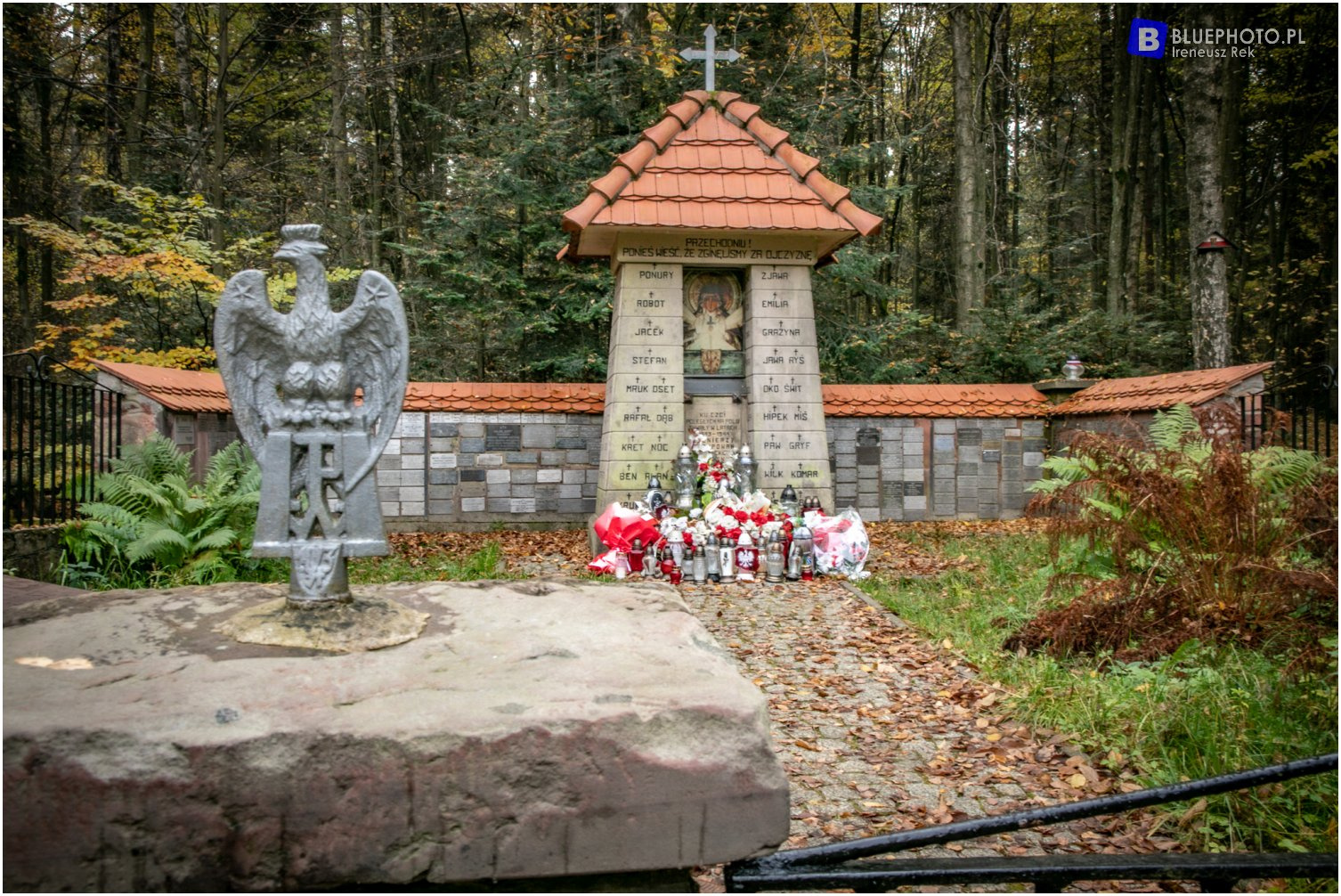 Przez malownicze i jesienne widoki zatrzymujące zaciekawione oko docieramy do zalesionego wzniesienia Płaskowyżu Suchedniowskiego nazywanego Wykus. Jest tu bardzo wiele ciekawych dróg, jednak większość, nawet szerokich i wyglądających na publiczne ALP trzyma w swoim ręku i nie pozwala na wjazd. A szkoda, bo miejsce to jest wyjątkowe. Podczas powstania styczniowego stacjonowali tu powstańcy dowodzeni przez Mariana Langiewicza. W trakcie II wojny światowej znajdowały się tu obozy żołnierzy polskiego podziemia, najpierw pod dowództwem mjr. Henryka Dobrzańskiego „Hubala”, później Zgrupowania Partyzanckie AK „Ponury” – por. cc. Jana Piwnika „Ponurego”. Koniecznie zatrzymajcie się przy kapliczce zbudowanej ku pamięci poległych żołnierzy Zgrupowania Partyzanckiego AK „Ponury”. Zaparkować można na wyznaczonym parkingu i po krótkim spacerze dotrzeć na wspominanie miejsce.
